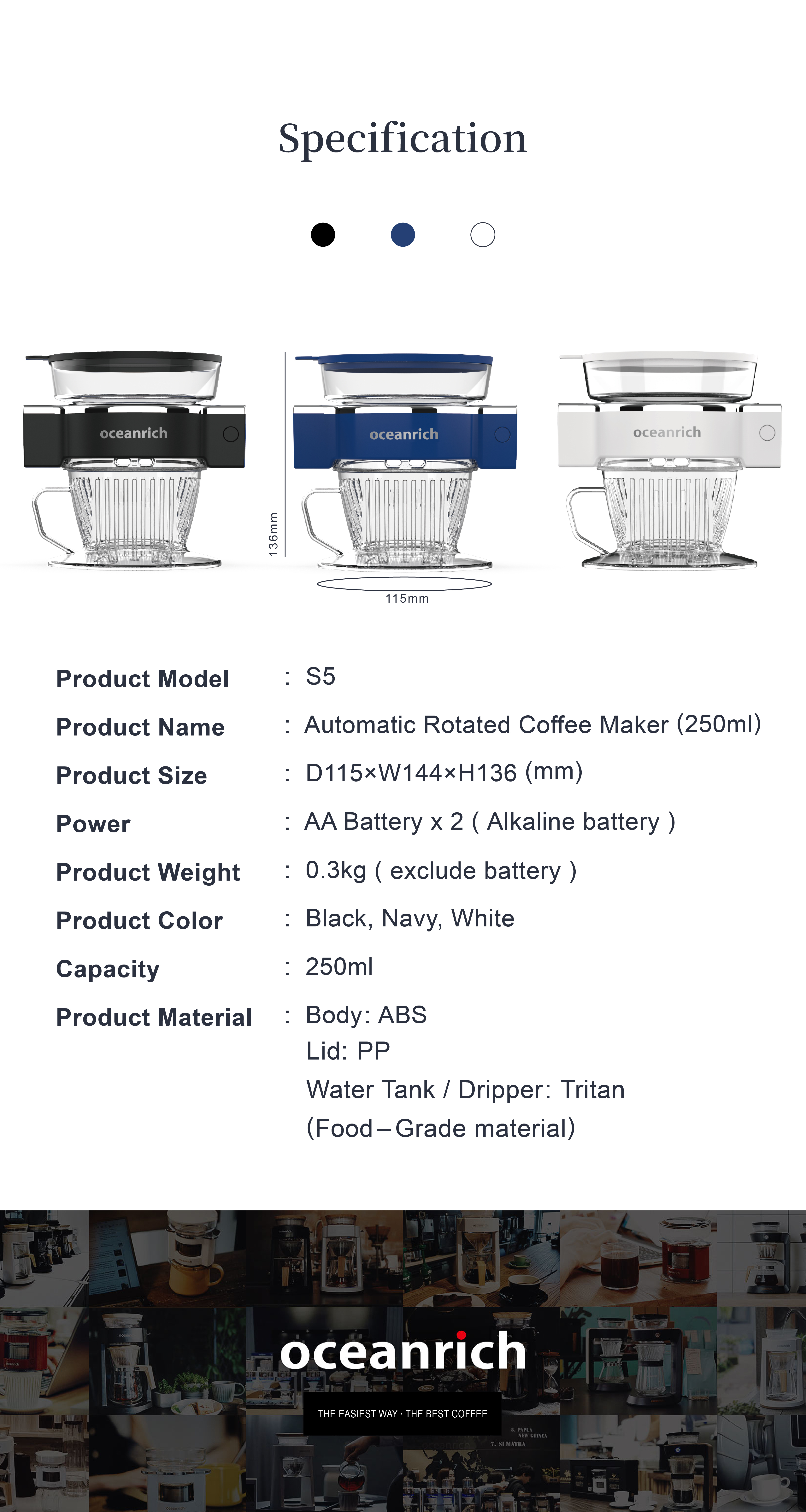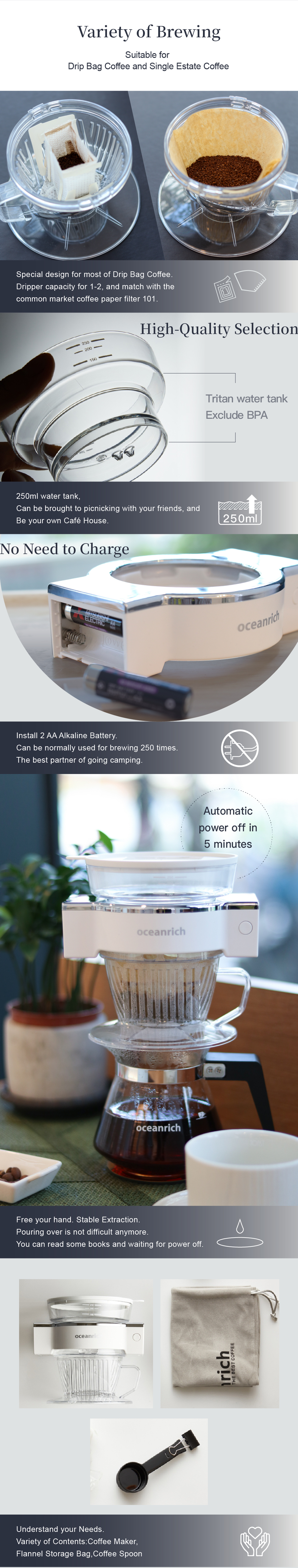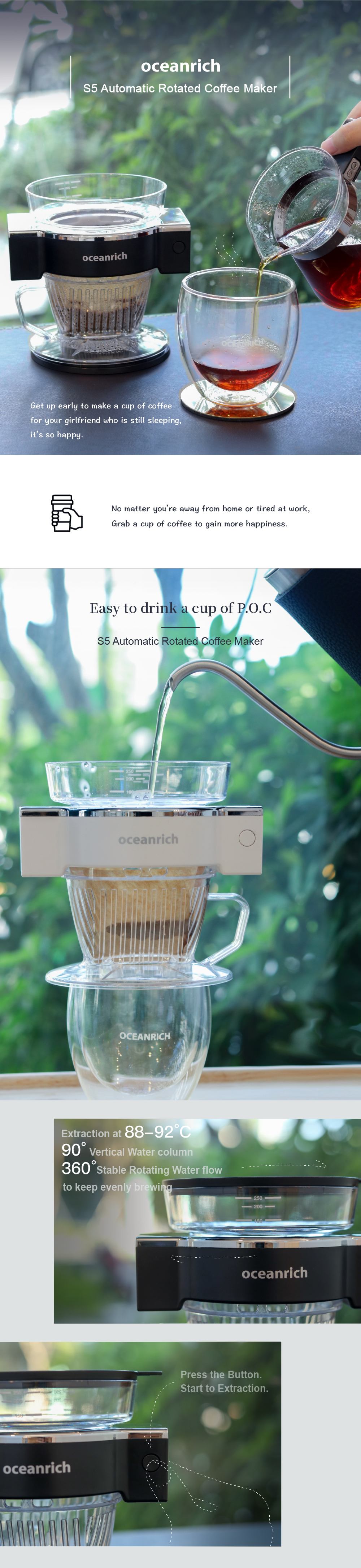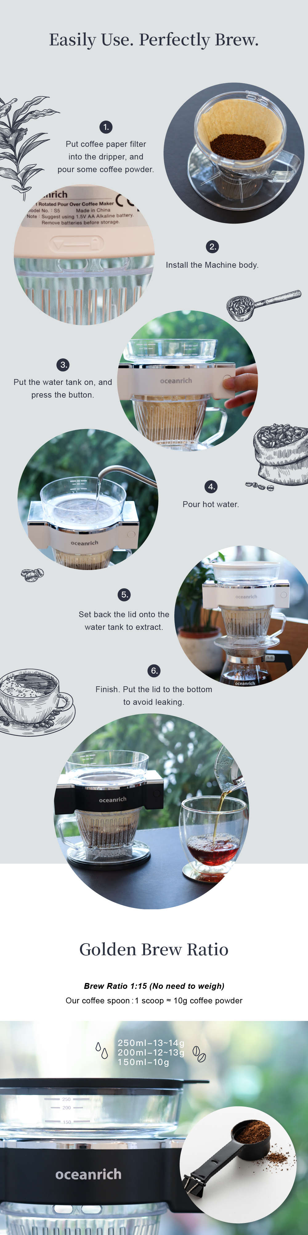Dripper upgraded!! Looks more professional, and tastes still flavorful! Capacity is 250ml, and could be 360° automatic rotated evenly extraction. Easy to carry, only need 2 AA battery, you can be your own "Coffee Master"!
