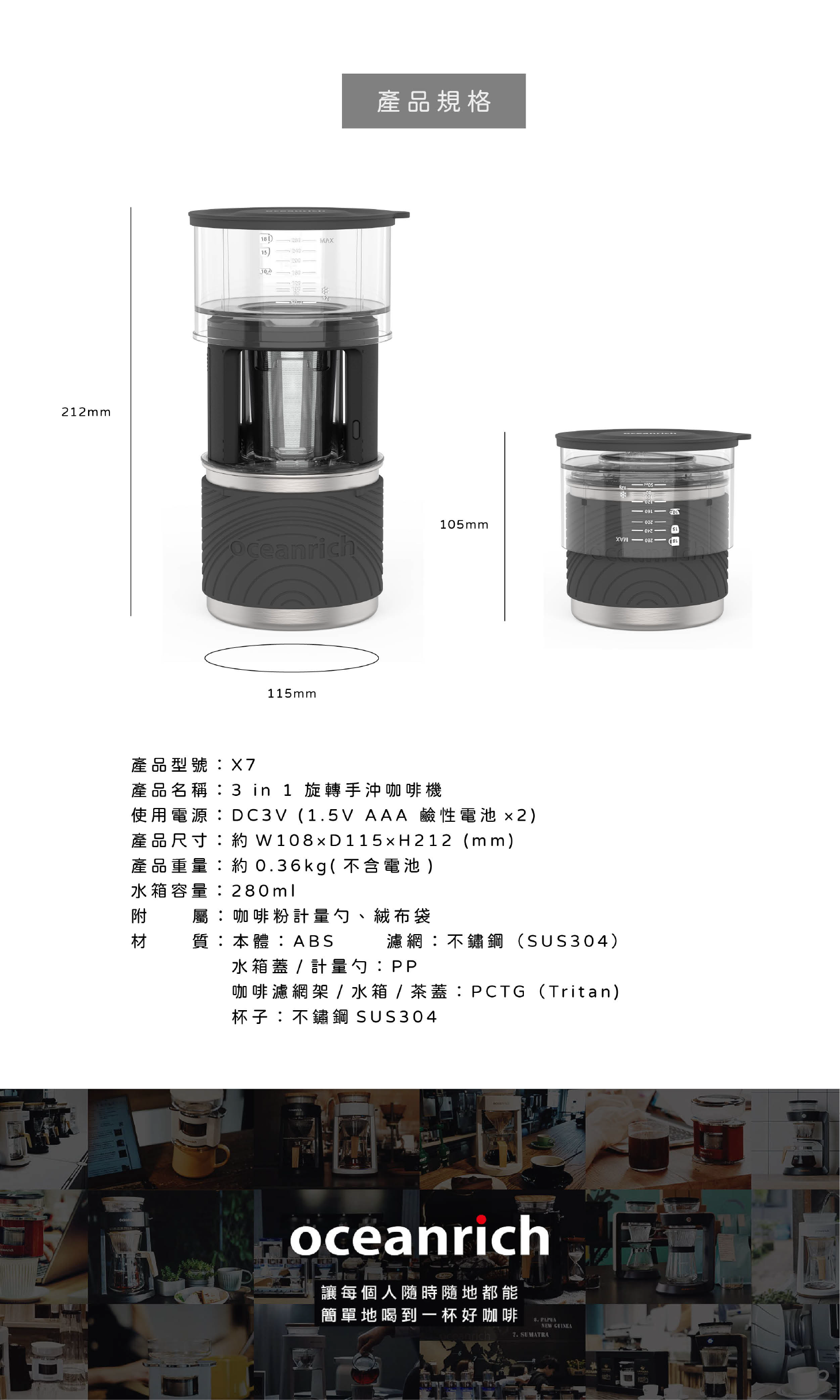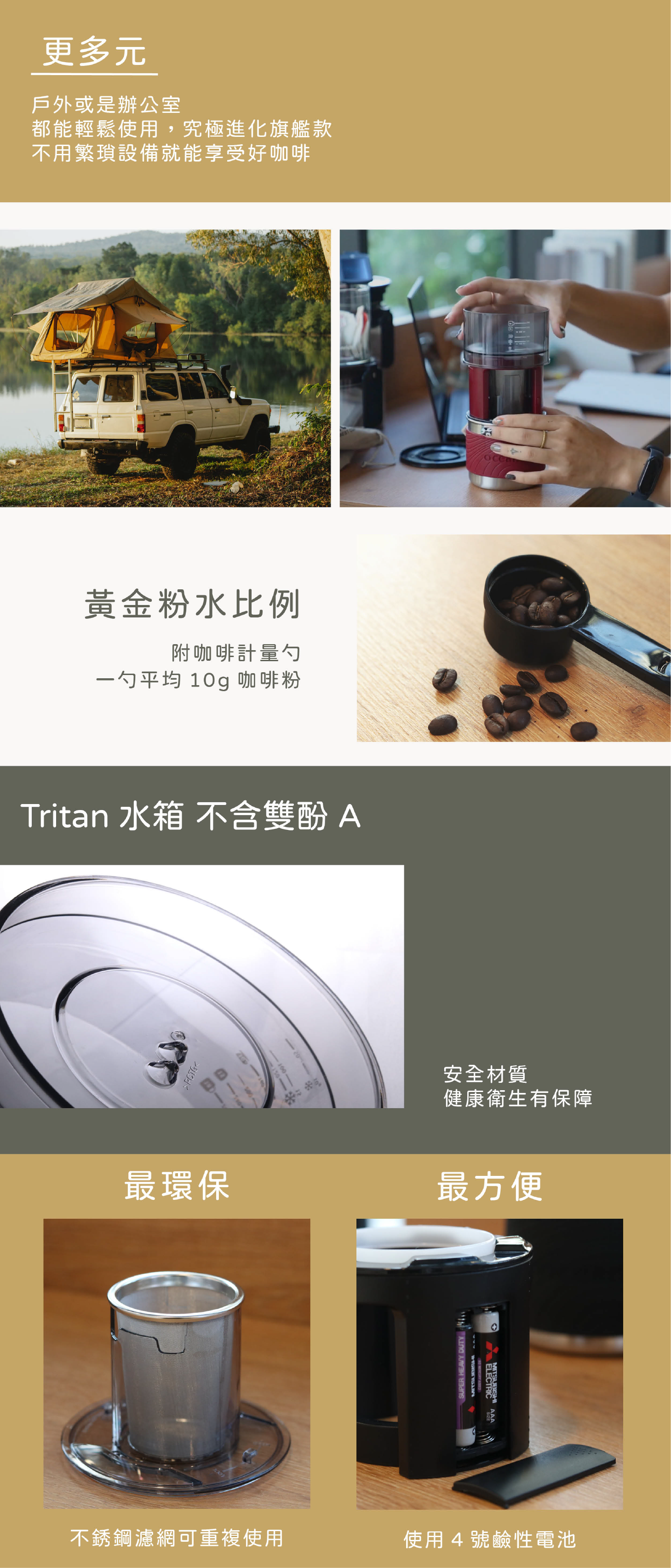 | 更多元 | 在戶外或辦公室,都能輕鬆使用,究極進化旗艦款,不用繁瑣設備就能享受好咖啡